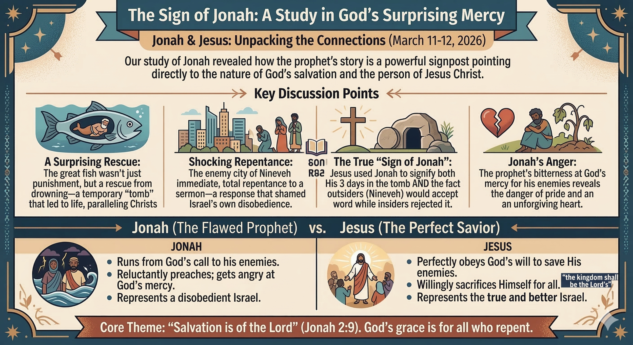 Section Summary: We examined how Jesus uses Nineveh's repentance as the "sign of Jonah" to condemn the unbelief of his generation. We discussed how Jonah's anger at God's mercy reveals the danger of spiritual pride and an unforgiving heart, concluding that the story points to the gospel, where Jesus opens God's grace to all people.