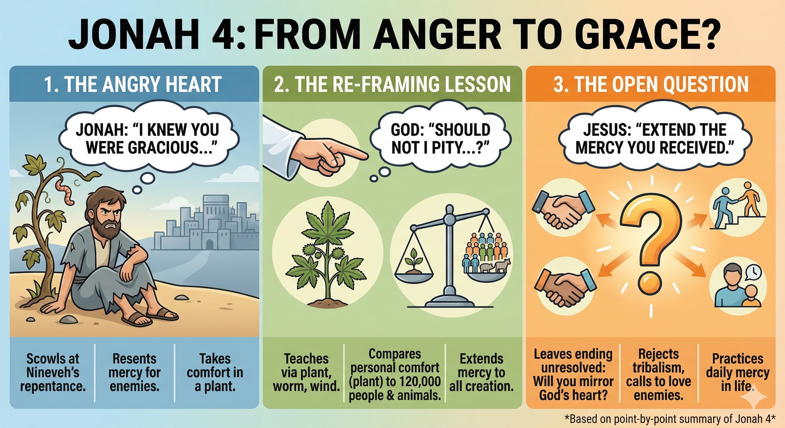 Jonah 4 reveals a prophet angered by God’s mercy to enemies, exposing hypocrisy about grace.