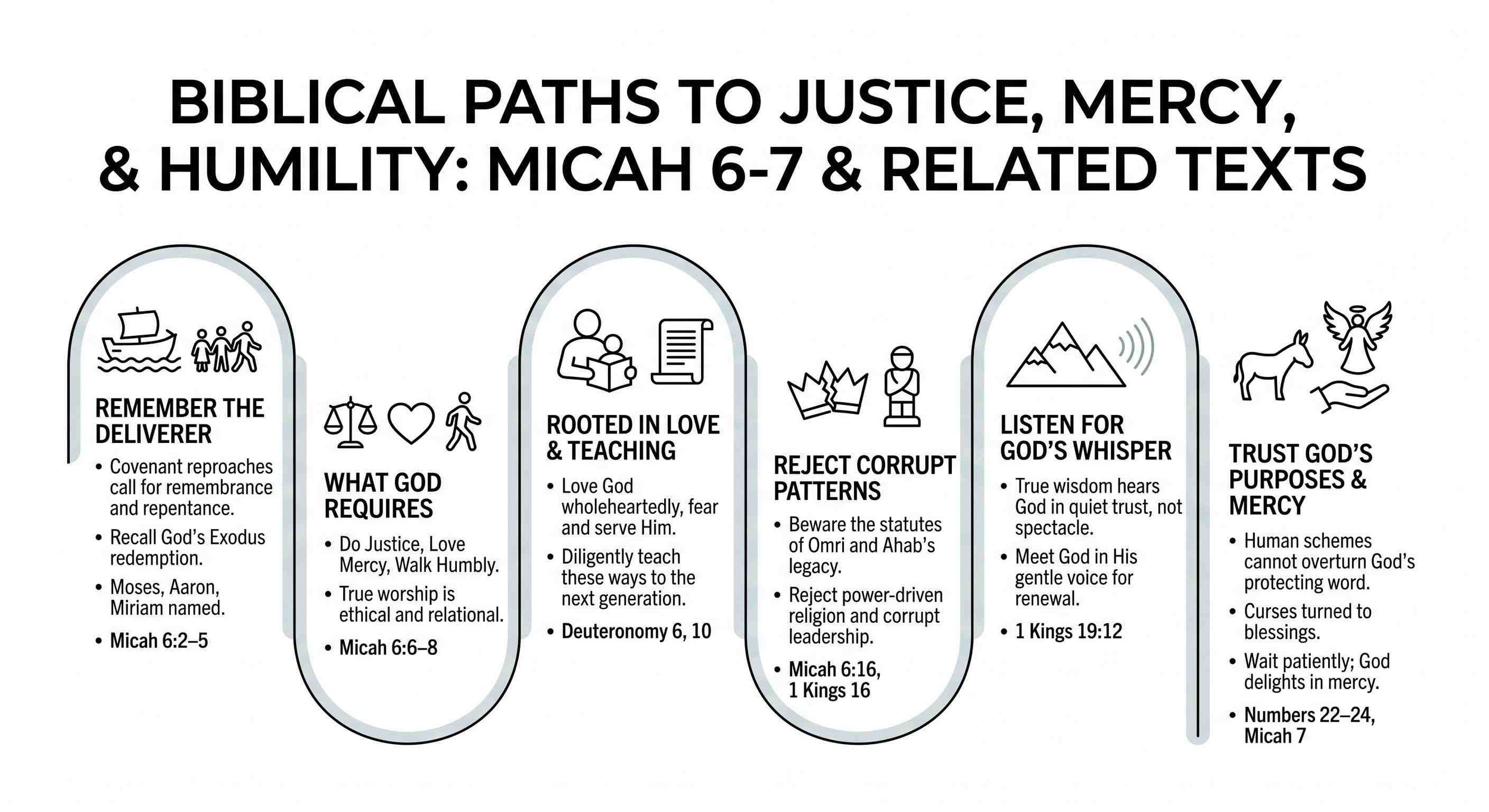 On April 23, 2026, we traced a biblical thread from Micah 6–7 through Numbers, 1–2 Kings, Deuteronomy, and the Gospels. We reflected on God’s covenant complaint and Exodus deliverance (Micah 6), the warning of Omri/Ahab/Jezebel’s corrupt statutes, Balaam and Balak’s failed cursing scheme, and Elijah’s renewal in God’s gentle whisper. We connected Micah’s call—do justice, love mercy, walk humbly—to Deuteronomy’s love-and-teach foundation and Jesus’ words about allegiance and endurance amid familial and societal conflict (Matthew 10; Mark 13). We concluded that true wisdom remembers God the Deliverer, rejects power-driven corruption, listens for God’s quiet voice, and lives justice and mercy in faithful trust.