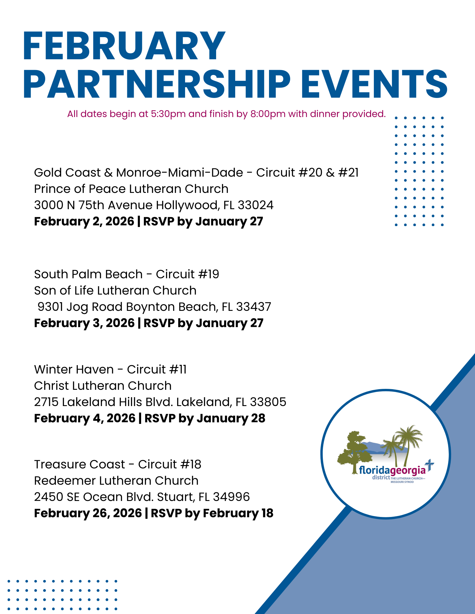 These events are designed to strengthen our partnership, get to know one another and learn more about your District’s Vision and the Ministry Targets.